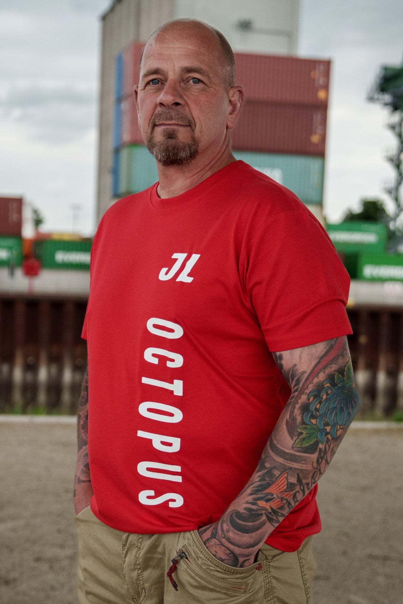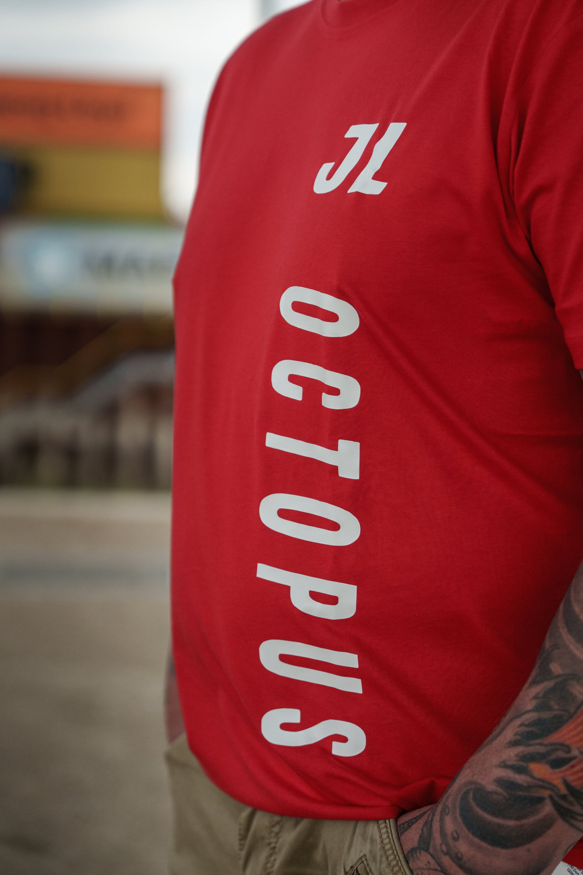"Scarlet Depths“ – Produkte in Rot mit großem Rückenlogo und JL Octopus Schriftzug in Weiß